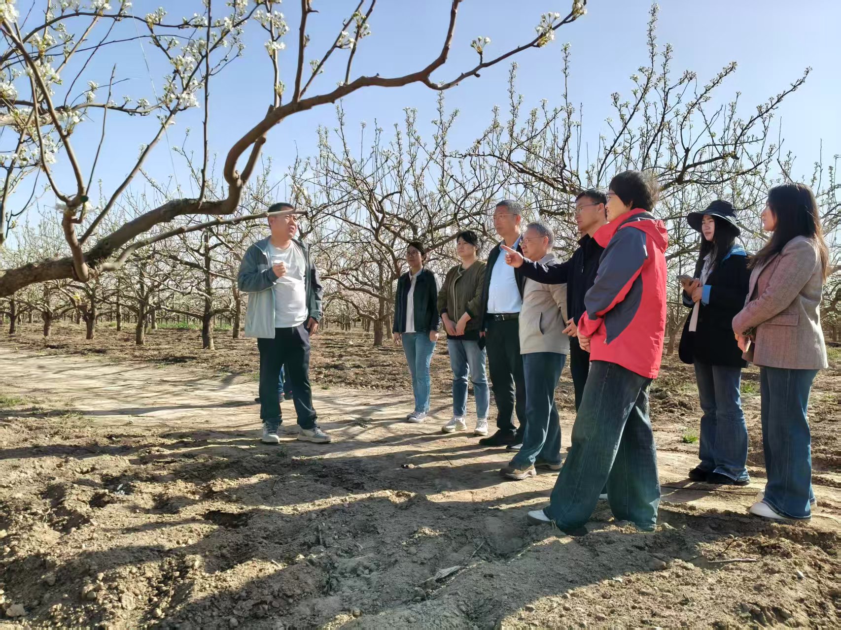 专家团队深入生产一线,实地考察梨树栽培、机械化作业、水肥一体化、采后加工及品牌运营等关键环节,精准把握产业发展现状与技术难点。针对西北干旱地区气候特点,团队围绕土壤改良、绿色防控、优新品种选育、花期冻害防护、长效保鲜等产业痛点,现场制定可落地实施的技术方案,助力产业提质增效。